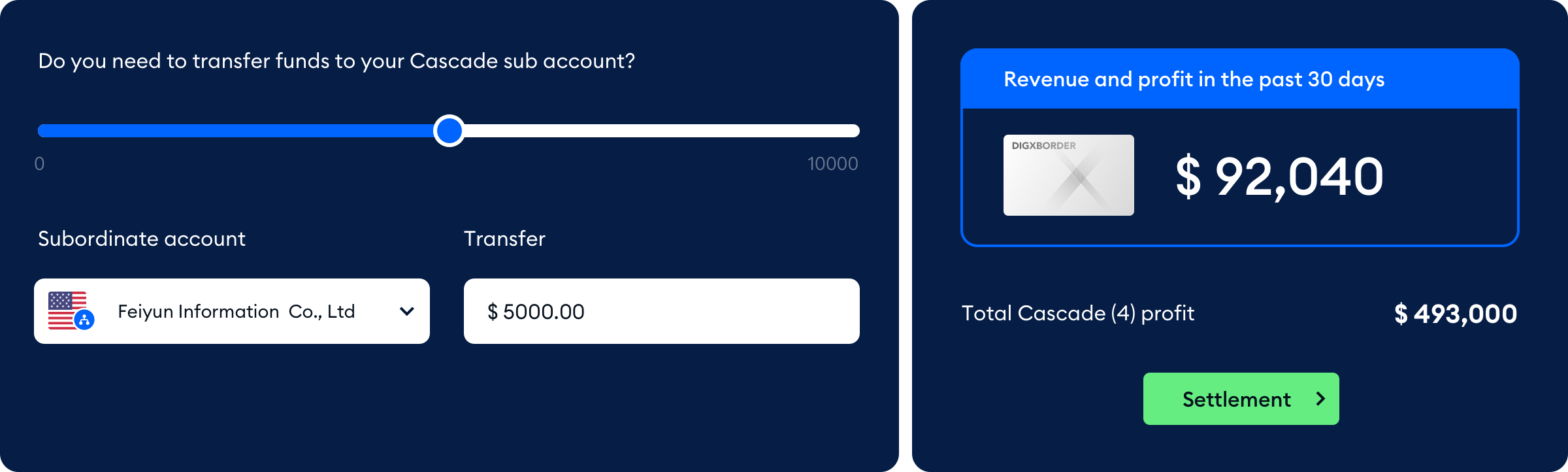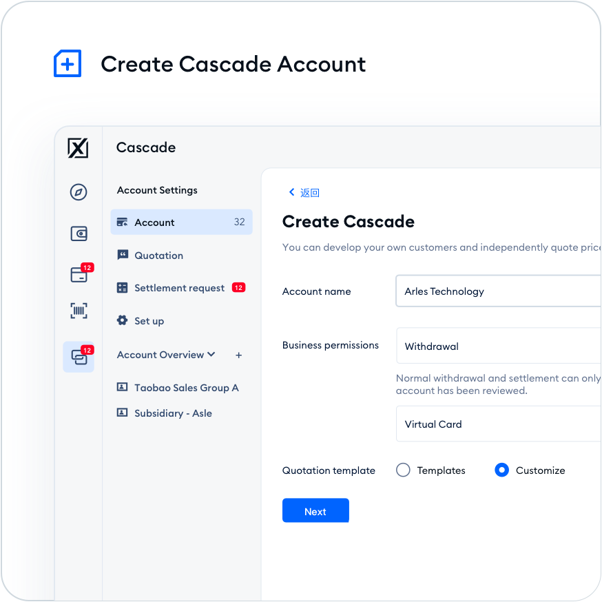Suitable for various business scenarios, including but not limited to online and offline trade receipts, cross-border e-commerce payment settlements, internal fund allocation of enterprises, and payment transactions with suppliers, it can meet the diverse fund management needs of merchants.Collaborate with enterprises or platforms in other industries through CASCADE accounts to carry out joint marketing activities or establish strategic alliances. Promote the coordinated development of the industrial chain. Through this cross industry collaboration, financial institutions can leverage the channels and customer resources of their partners to quickly expand their markets, reach more potential customer groups, and achieve rapid growth in customer numbers.