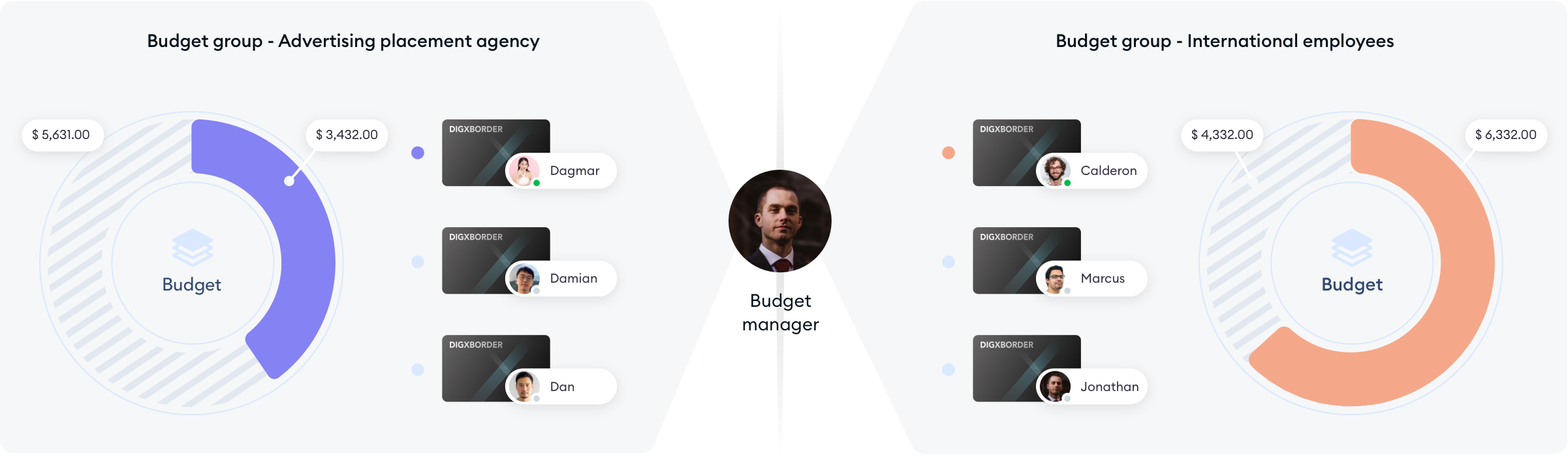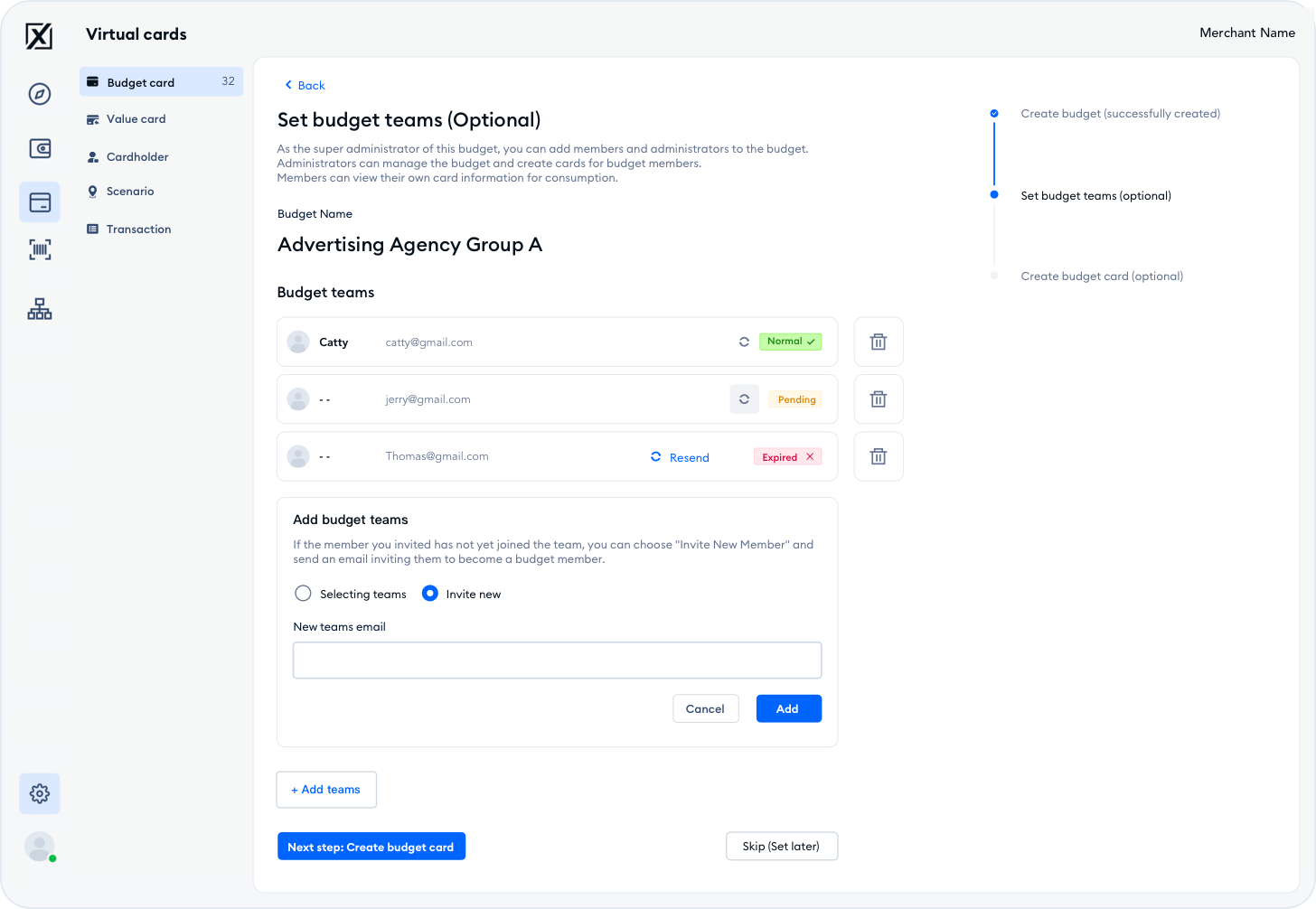 Budget cards are virtual cards supporting group budget management. There is no balance in the card, and all purchases are directly deducted from the budget account the cards are bounded.